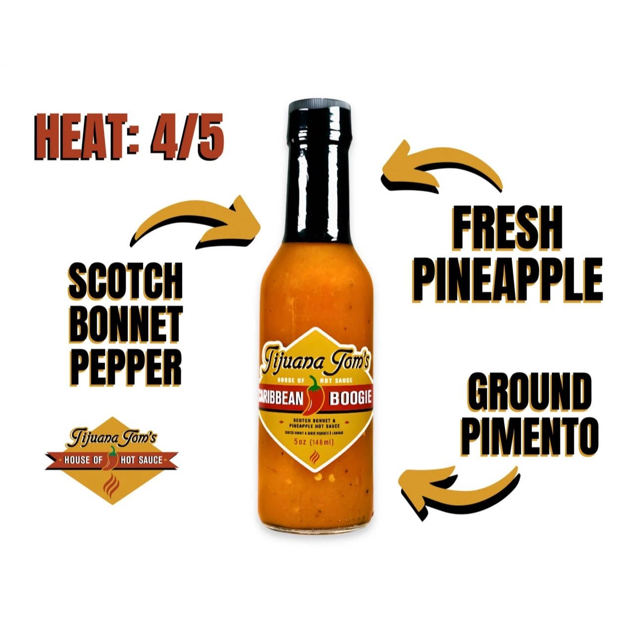 Tijuana Tom's signature artisan hot sauce Caribbean Boogie is inspired by the islands of the Caribbean with a yellow scotch bonnet base and blended with citrus and an all spice flavour punch. Pairs well with chicken and over nachos!