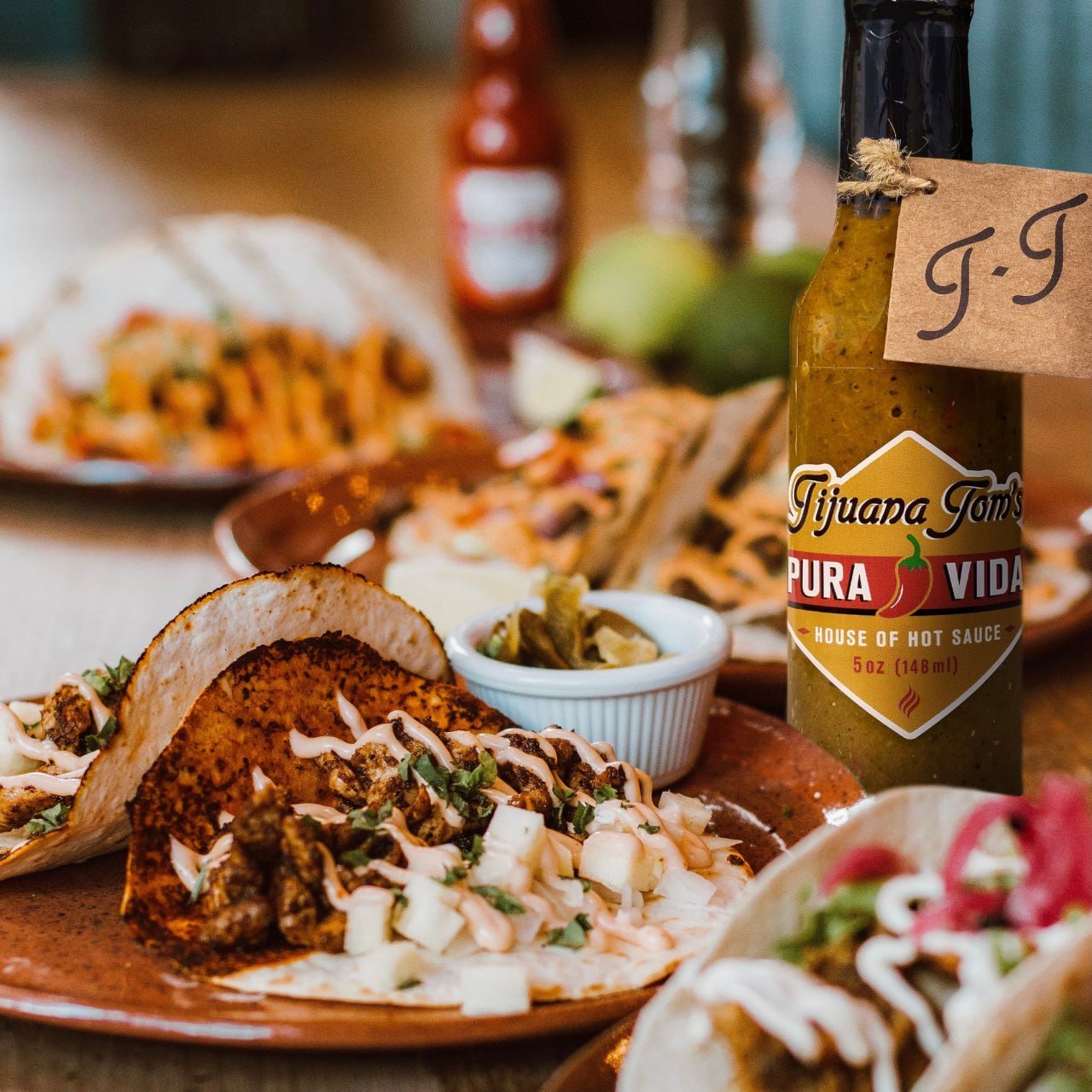 Tijuana Tom's signature artisan hot sauce Pura Vida inspired by the beautiful coasts of Central America. A roasted poblano pepper base heated with scotch bonnets, seasoned with garlic confit' & cilantro with notes of cumin. This sauce pairs well with all proteins, vegetables and tacos of all kinds.